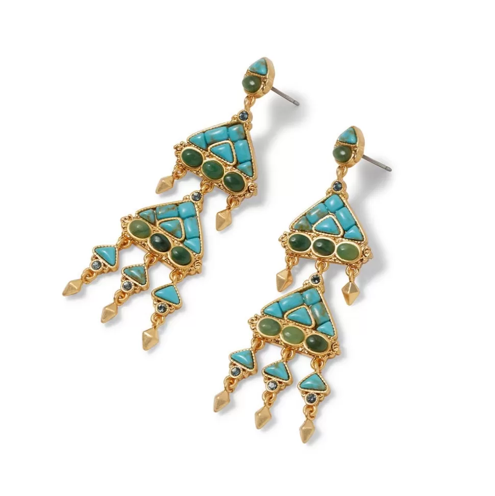 The late 19th–early 20th-century Tibetan amulet box, or ga’u, that inspired these earrings would have been worn around the neck to protect the wearer. Its form, comprising two intersecting squares that symbolize crossed vajras, or thunderbolts, suggests the stability of Buddhism, while its striking stone embellishments represent the crystalline nature of the heavens. Amulet boxes typically contained written or printed texts consecrated by monks, and often included pieces of cloth from an important lama’s robes. The eye-catching example in The Met collection belonged to a larger jewelry ensemble owned by a noblewoman.